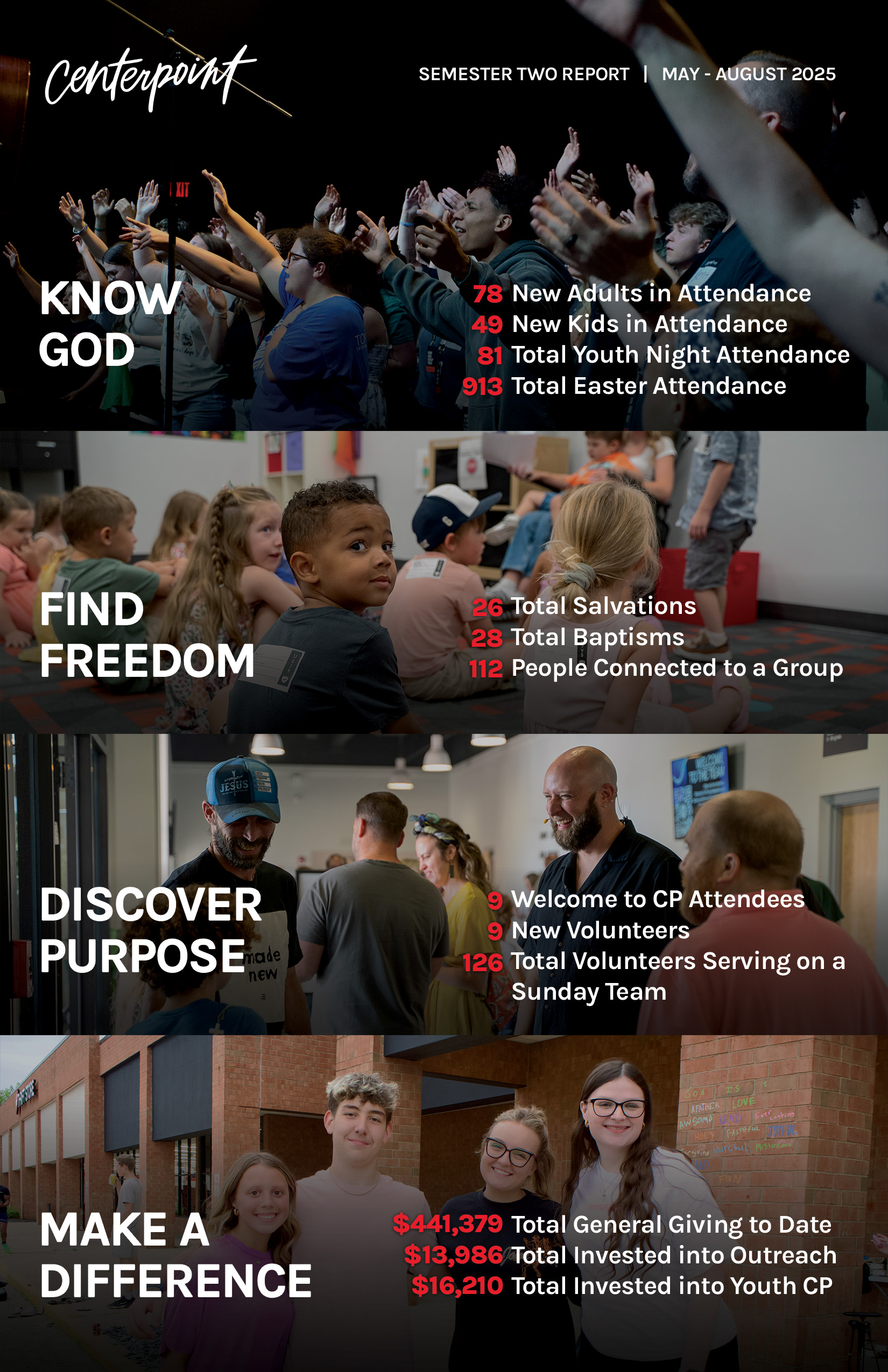 WATCH ONLINEJOIN US SUNDAYSChristmas at CenterpointJOIN US SUNDAYSJOIN US SUNDAYSWatch OnlineWATCH A SERMONEaster at CenterpointJOIN US SUNDAYSJOIN US SUNDAYSUpcoming EventsView events WE EXIST TO TRANSFORM THE FORGOTTEN CITIES IN OHIO WITH THE CRAZY LOVE OF JESUS.TIMES + LOCATIONSMALL GROUPSJOIN THE TEAMCENTERPOINT KIDSCENTERPOINT YOUTHOUTREACHCare & Counseling RequestGIVEMERCHShare Praises & Prayer Requests with us!Share Now